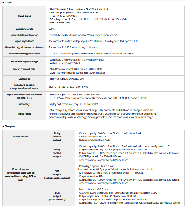 Various alarm functions. Multi-input and output functions. Communication function (RS 485). Freescale function. Automatic PID operation. Record and temperature control.