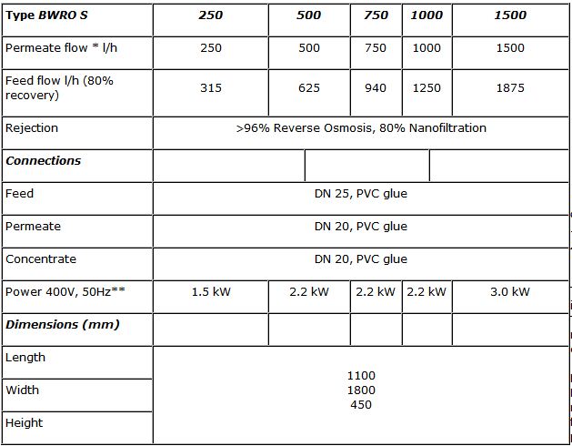 Low energy or high rejection membranes, All equipment mounted on stainless steel 304 skid, Available in complete Stainless Steel piping, Standard control with RO micro-controller and conductivity display, Advanced control with flow, pressure, pH and conductivity transmitters for data monitoring, normalisation and SCADA., The system includes: 5 microns filter, High pressure pump, RO or NF 4 ` membranes, Fiber glass pressure vessels, Standard or advanced instrumentation, Option: antiscalant dosing station.