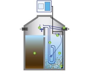 In the SBR tank, intermittent aeration takes place until the mechanical ball-type float (3) activates the air lift (4) due to the higher water level. This activation leads to sludge recirculation in several short pump strokes.