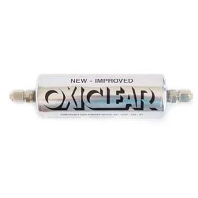 Body material: Polished Aluminum. Fittings: 1/8" Nickel-plated brass, secured with epoxy. Fill material: 120ml of Q5 + 13X Molecular Sieve. Capacity at normal flow rate: 484 scft of inert gas (about 1.5 standard 300 cft cylinders) with 10 ppm Oxygen.