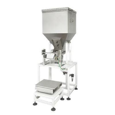 Practical for automated or semi-auto processes with operators placing and removing containers, the small vibratory feeders fill a small bucket which sits on load cells and dispenses into the package or process when it reaches the target weight.