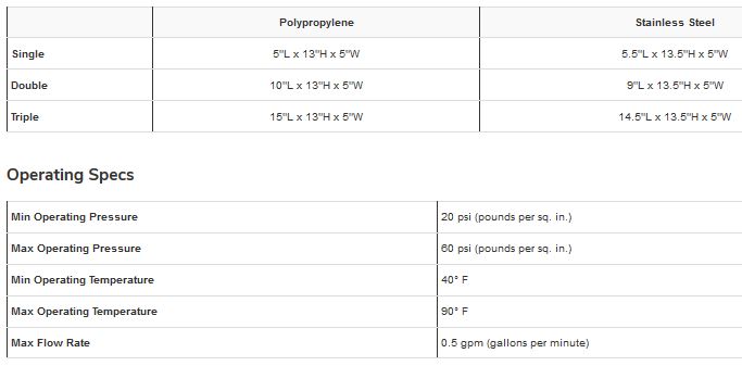 Water travels through a 5-micron solid carbon cartridge for removing volatile organic carbon compounds (VOC`s), insecticides, pesticides and industrial solvents and traps particles larger than 5 microns including sediment, silt, sand, and dirt.
