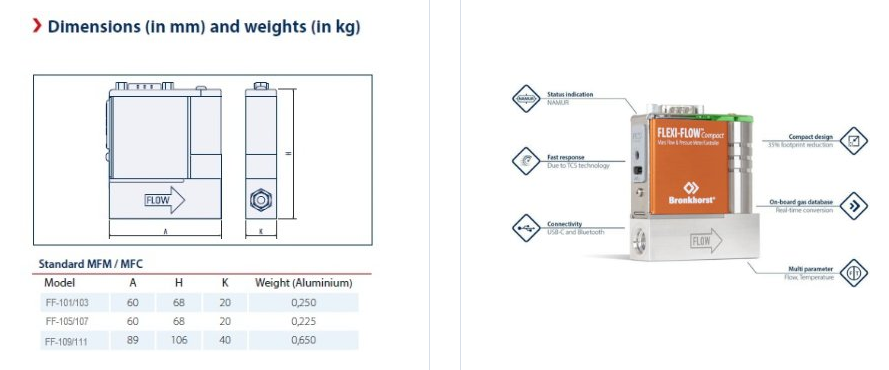 8 pre-installed gases, 22 gases available via Bronkhorst FlowSuite. Flow and Temperature measurment. Compact design. Up to 16 bar(g). Bluetooth and USB-C connection with free software Bronkhorst FlowSuite. Fast response due to TCS technology.