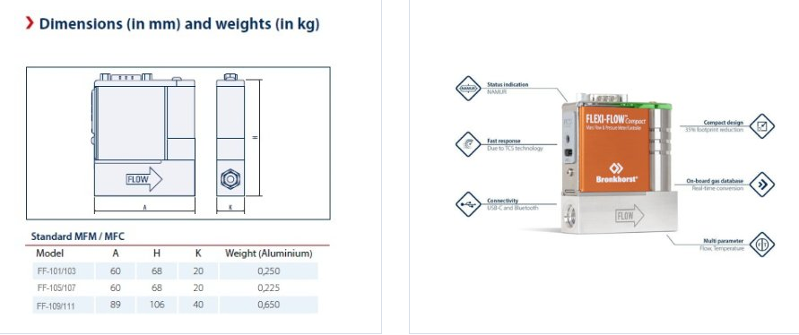8 pre-installed gases, 22 gases available via Bronkhorst FlowSuite. Flow and Temperature measurment. Compact design. Up to 16 bar(g). Bluetooth and USB-C connection with free software Bronkhorst FlowSuite. Fast response due to TCS technology.