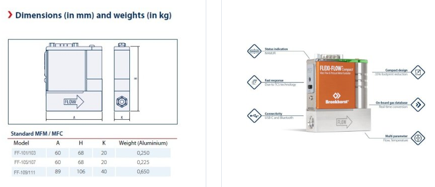 8 pre-installed gases, 22 gases available via Bronkhorst FlowSuite. Flow and Temperature measurment. Compact design. Up to 16 bar(g). Bluetooth and USB-C connection with free software Bronkhorst FlowSuite. Fast response due to TCS technology.