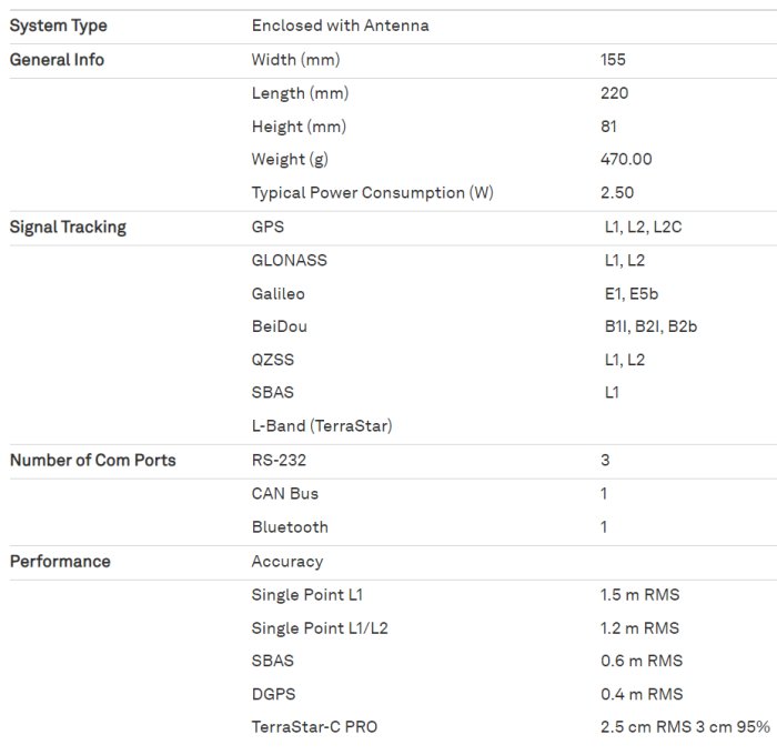 - GPS, GLONASS, BeiDou, Galileo, QZSS plus TerraStar correction signal reception