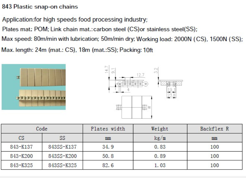 The 843 chain is designed with overlapping plastic flights assembled on a special roller chain with extended pins.This is an advantage especially at high speeds, because it reduces the noise level. The Snap-On chains are very suitable for the food processing industry. The 843 chain has a 0.50 in. pitch roller base chain and the plastic flights can be supplied in widths from 25.4 mm (1.00 in.) to 82.6 mm (3.25 in.).