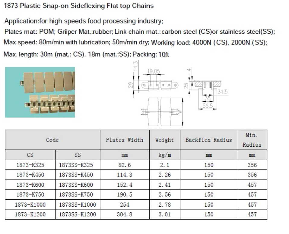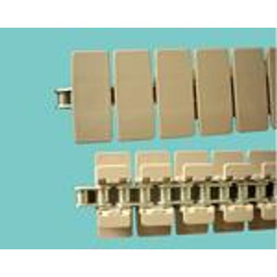 The 1873 chain is a side flexing Snap-On chain designed with plastic flights assembled ona special roller chain with extended pins. This is an advantage especially for high speeds, because it reduces the noise level. The Snap-On chains are very suitable for the food processing industry. The 1873 chain has a 0.75 in. pitch side flexing roller base chain and the plastic flights can be supplied in widths from 82.6 mm (3.25 in.) to 304.8 mm (12.00 in.).