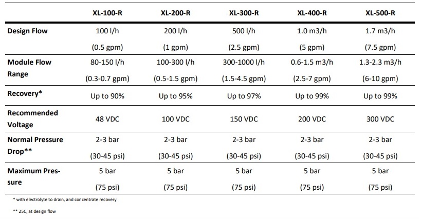 XL-R Electropure EDI products can handle a range of flows from 50 l/h to 2.3 m3/hr (10 gpm), depending on the specific requirements of the customer. These are designed for rugged industrial EDI systems, whether made from PP or PVC or Stainless Steel.