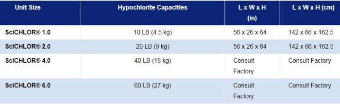- SciCHLOR 6.0 – 60 pound (27 kg) of hypochlorite per day
