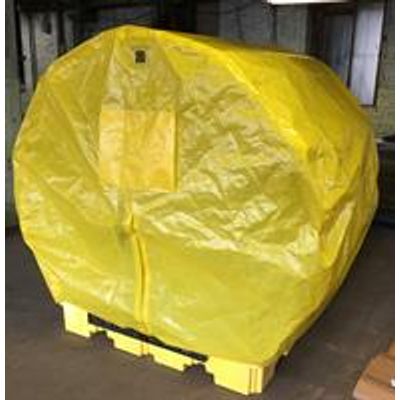 The NEW Eagle Soft Top Containment Unit provides protection from the elements for up to four 55 gallon drums with a durable soft top cover built on a 4-drum HDPE containment pallet. Ships unassembled for reduced shipping costs. Easy step-by-step assembly for a secure and quick weather resistant containment solution. The height of the cover allows storage with drum pumps in place. The four drum pallet is 100% HDPE construction that resists corrosion and weathering. The flexible soft top is constructed of high-vis yellow PVC fabric over a rugged galvanized steel frame. Access drums through the front or back. For maximum loading and unloading ease use with the Eagle HDPE Poly Ramp (Model 1689 - Sold Separately). Made in the USA.
