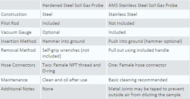 When measuring radon underground, it is essential to collect samples without exposing them to the outside air. We offer two heavy-duty soil probes for this purpose: the Hardened Steel Soil Gas Probe, and the AMS Stainless Steel Soil Gas Probe. The specifications of these two soil gas probes are listed below:
