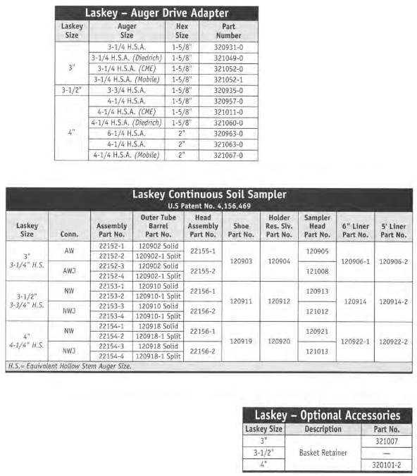 The Laskey Sampler was designed to recover continuous, relatively undisturbed soil samples when drilling with Hollow Stem augers and works similarly to the Acker Oenison Soil Sampler.