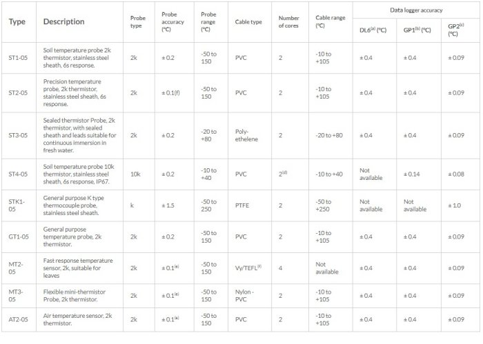a: Additional (worst case) error due to DL6 Data Logger at -10 to +50 °C. b: Additional (typical) error due to GP1 Data Logger at 0 to +60 °C. c: Additional (worst case) error due to GP2 Data Logger at -20 to +60 °C. d: Co-axial single-core with screen acting as signal loop. e: Over 0-70 °C. f: Teflon lead, vinyl tip.