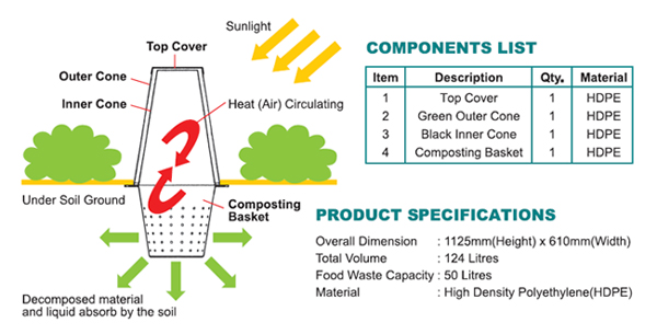 It is suitable for all kinds of food wastes from households and food outlets. The green coloured exterior is pleasant and blends aesthetically to any garden. - Easy Installation