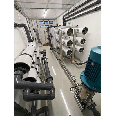 The SolarRO SW 300 is a seawater reverse osmosis desalination system from Solar Water Solutions, designed for off-grid and remote coastal environments with high salinity up to 36,000 mg/L TDS. It produces clean water at a rate of 13 m³/h with a recovery rate specified for efficient operation