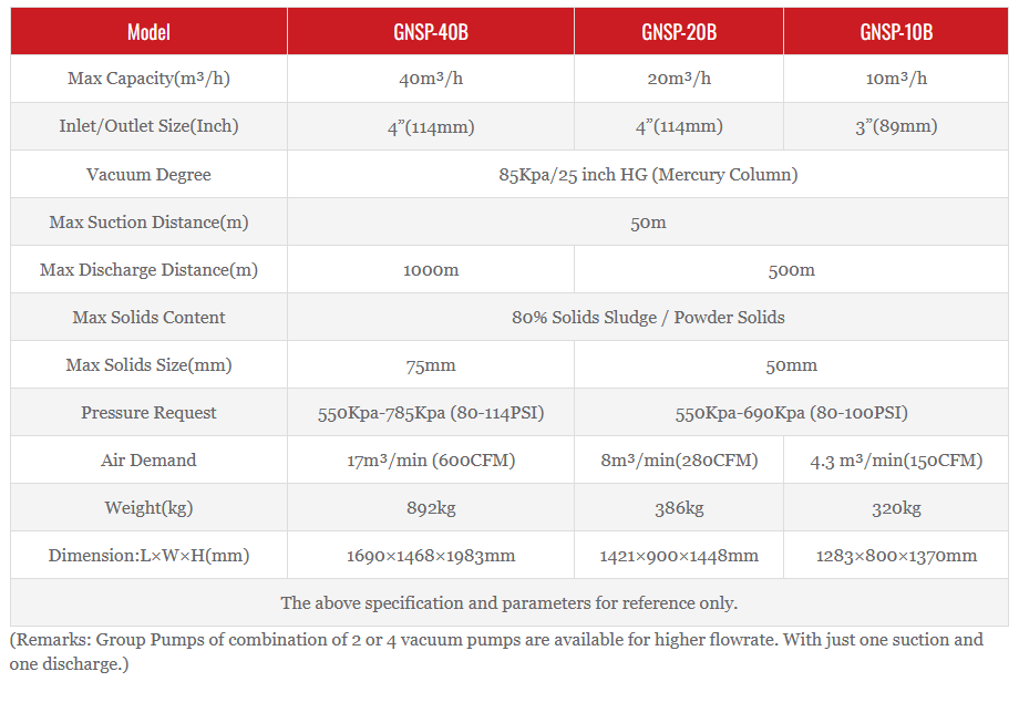 GN Solids Vacuum Pump is called sludge vacuum pump. It is a vacuum loading solids transfer pump.GN Solids Vacuum Pump is fully powered by compressed air to transfer solids, powder, slurry, sludge etc. GN Solids Vacuum Pump is a compact, robust, and efficient pump which is capable of loading material via 25"hg of vacuum and delivering the over 500 meters. GN Solids vacuum pump single unit is available in 10 m3/h, 20 m3/h and 40 m3/h. GN also is capable to design and make Group Pump Unit in one skid with one.