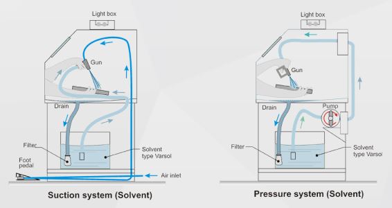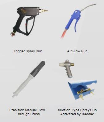 Contrary to pressure jet systems, suction-type vaporization systems operate using the Venturi principle, sucking fluid from cleaning accessories. Liquid output is wide spray jet that covers large section of part that needs cleaning, and air is added to dislodge hard-to-remove oil and grease. Cleaning accessories are activated with foot treadle.