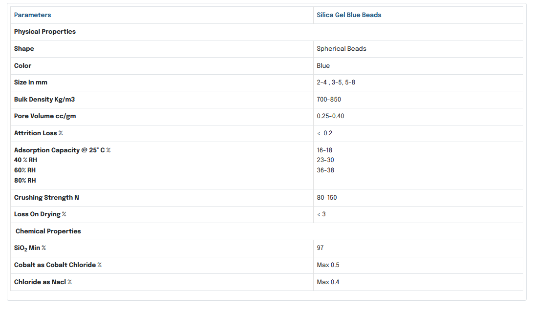 The granular gel can absorb up to 40% of its weight in water vapor. When it reaches approximately 8% of its weight in water, the crystals` color changes from blue to light pink. As the beads take up moisture, their color changes to light pink gradually. This blue silica gel is primarily used as an indicator for moisture absorption in sealed containers, particularly in industrial applications where it is supplied in small pouches or bulk quantities. The blue crystals are mainly used in breather transformer applications and are also supplied in bulk quantities. Sorbchem India is a reliable supplier and manufacturer of high-quality blue silica gel beads and crystals, ensuring favorable results and long-term use for food and pharmaceutical products packaging without any hazardous effects.