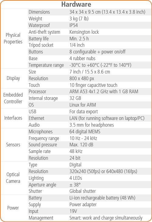 • 64 MEMS-microphones, 24 bit resolution, Samplerate 48 kHz, frequency range 10 Hz - 24 kHz