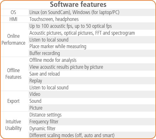 SoundCam consists of 64 microphones, an optical camera, an integrated data acquisition and analysis system, as well as a display and control unit with touchscreen and hardware buttons. The system displays high-resolution results in real time on the screen. What makes it so special is its high speed and accuracy.