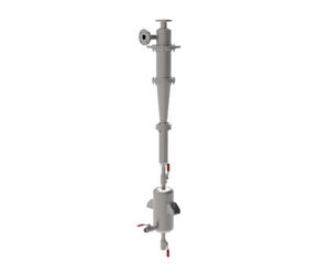 Materials: Fabricated from any metal; some units can be designed to accept replaceable ceramic liners. Can be built to ASME code specifications, if required. The accumulator tank on the bottom accumulates the solids for periodic discharges.