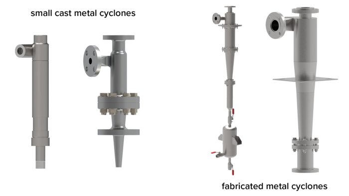 Sizes: Cyclone diameters range from 0.5" to 2". Standard connections are threaded but flanged connections can also be supplied.