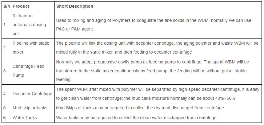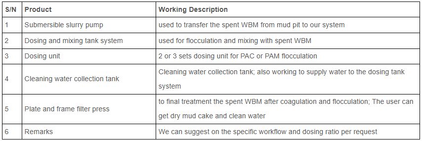 The Spent Water-Based Mud (WBM) Dewatering System is used to treat water-based mud that is generated during the drilling process. Two common methods are centrifuge and polymer unit, and filter press and polymer unit.