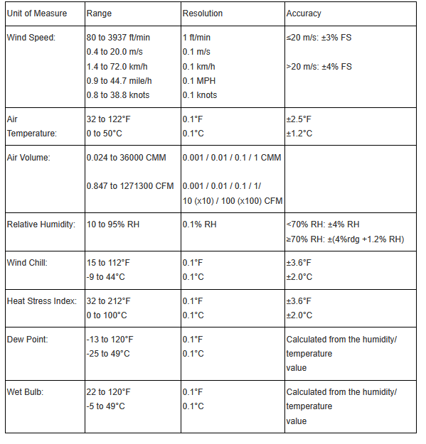Reads air speed in addition to the wide selection of environmental parameters detailed above. Will sense airflow as low as 0.4 m/s with an accuracy of ±3% (4% >20m/s). Replaceable snap-in anemometer vane is available. Features min/max, hold, a backlight and come complete with a wrist strap, carry pouch, and button cell battery providing at least 40 hours of continuous use.