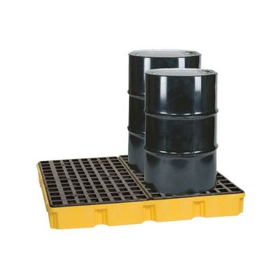 Eagle`s one piece 4 Drum 1635 Spill Containment Modular Platform is constructed of yellow high density polyethylene (HDPE) for excellent durability and chemical resistance. Features a sump capacity of 60.5 gallons, measures only 6.5" high and has black HDPE flat top grating which removes easily for cleaning. Forkliftable design (no drain). Platforms can be easily connected with built-in U Channels. Compatible with the Eagle Poly Pallet Ramp (EM-1689 in yellow and EM-1689B in black) for easier loading and unloading. Meets EPA 40 CFR 264.175 and is SPCC Compliant.