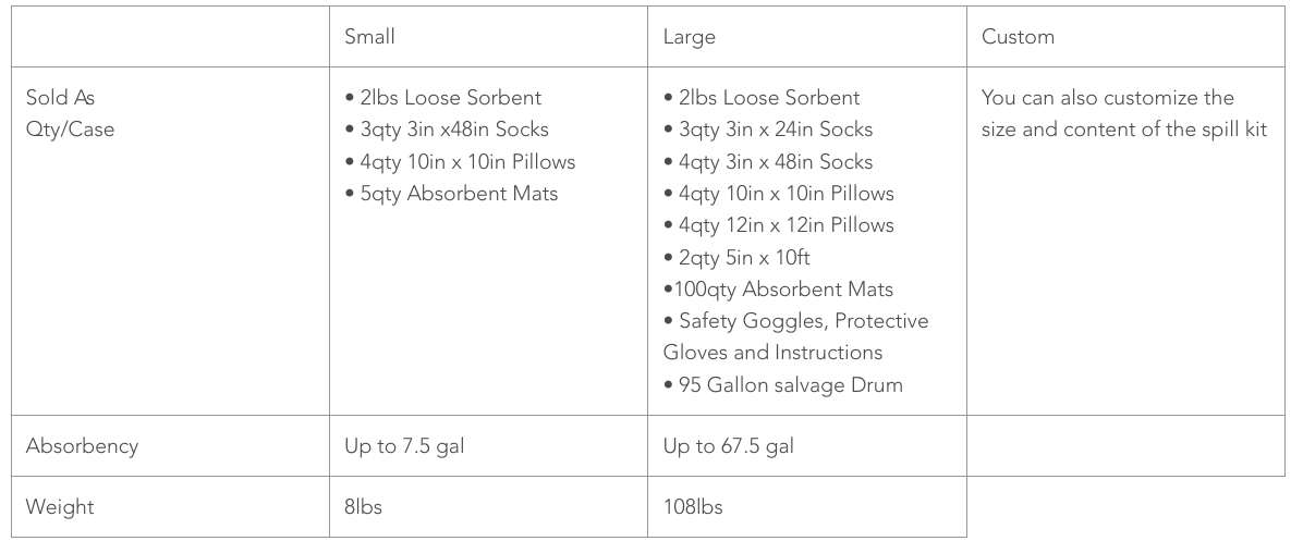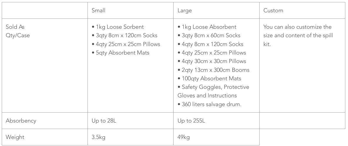 - The small spill kit includes a flexible bag for simple transport and hanging and instructions. Compact design for easy storage.
