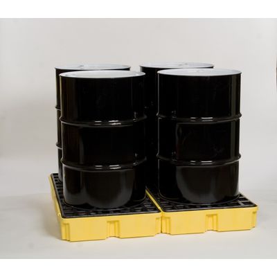 Eagle`s two piece 4 Drum 1634 Spill Containment Modular Platform is constructed of yellow high density polyethylene (HDPE) for excellent durability and chemical resistance. Features a sump capacity of 30 gallons per side, measures only 6.5" high and has black HDPE flat top grating which removes easily for cleaning. Forkliftable design (no drain). Compatible with the Eagle Poly Pallet Ramp (EM-1689 in yellow and EM-1689B in black) for easier loading and unloading. Meets EPS 40 CFR 264.175 and is SPCC Compliant.