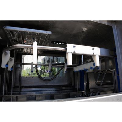 After the washing stations the salad will be freed from water in the innovative spinning system. Thanks to the centrifugal force the gripper arms are slowly pressed up like being in a carousel – the salad is not pressed sideways onto the walls of the crates, it`s pressed down to the floor of the crates, which is very gentle processing and doesn`t damage the salad. The acceleration and the revolutions can be configured to set the required moisture level.