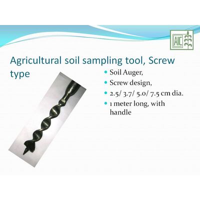 The spiral auger operates similar to a corkscrew and does not cut off the soil. The auger is usually applied when hard layers need to be penetrated. The spiral auger has a negative end, i.e. the centre of the auger end is whetted away. Soil Auger, Screw type, one metre long with handle. Size: 2.5cm dia / 3.7cm dia / 5.0cm dia