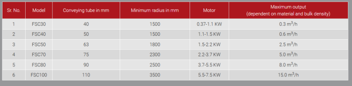 For different output ranges from 0.1 to 15 m3/h and different materials, several type of Spiral Conveyors are available, which are different in outer tube`s and spiral`s diameters.