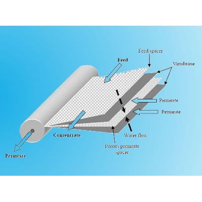 Spiral membranes are used in a wide range of water treatment applications. The feed flows through parallel channels over the length of the element. Clean water passes through the semi-permeable membrane. The permeate spacer allows the water to travel all the way to the permeate tube. The brine, remaining stream from feed less permeate, is the concentrate which flows out at the end of the membrane element. The spiral-wound element offers a wide range of configurations with different membrane spacers and types of membrane material. DeFraWater® offers a large variety of DFSW Membranes.