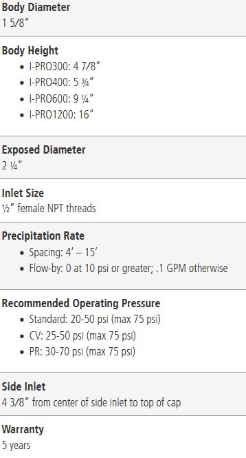 Irritrol’s I-PRO Series spray heads combine a pressure-activated wiper seal and advanced formula lubricant that virtually eliminates troublesome stick ups. Add a unique tapered lip design that prevents debris from entering the body and you have a spray head with superior performance. It’s rugged and reliable with a textured body style for a non-slip grip and even easier installation. Available in four pop-up heights with side inlet, pressure regulation and check valve options, the I-PRO Series fits most landscape application.