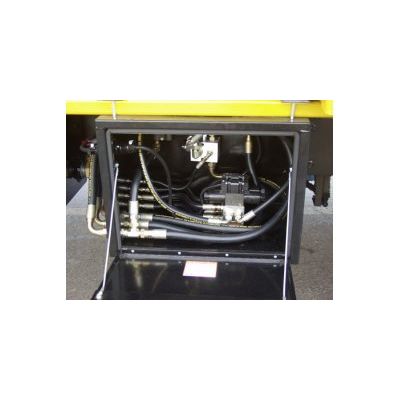 All solenoid valves and other electronic controls are in a control box, mounted out of the way under the edge of the spreader in a heavy duty weather tight box. Mounted in front of the control box is a full flow oil filter. All oil entering the hydraulic pumps is filtered.The entire system has been designed with the thought of eliminating as many problems as possible. From the control panel in the cab to the control box, the components that make up the brain of an FSI EzSpred Fp are protected from the dirt and acids the can cause a system to fail. No control cables are used, so you don`t have to worry about cables becoming rusty and failing.