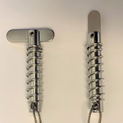 Stainless steel, spring activated connector pins are used to lock together two universal aluminum Z connectors. The Z connection plates interlock to form a strong union between two sections of oil containment boom or turbidity curtain. The self locking pins fit through holes aligned on each Z connector and lock into place when the spring flips the latch 90 degrees when inserted. The connector pins feature a stainless steel lanyard that is used to permanently connect the pins to the end connector plates. Texas Boom Company offers these spring activated toggle pins as replacements for connector pins that have become lost. These stainless steel (ss) connector pins are fabricated to endure long term exposure to salt water. Sold in packs of 10.