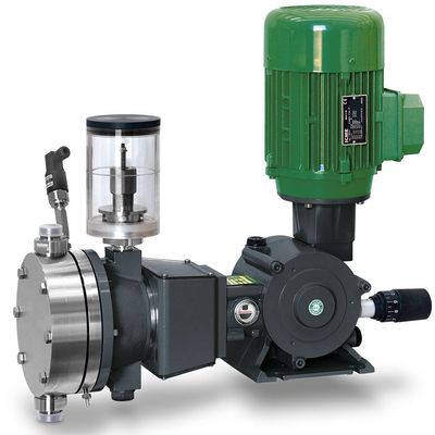 A built-in safety valve is installed in the hydraulic circuit, in order to protect the diaphragm against over pressure. The peculiarity of this pump is the special sandwich diaphragm and the reliability of the diaphragm rupture detection system. Each pump has a standard gearbox reduction system and is available with an IEC B14 electric motor that meets UNEL - MEC specifications. The motor power range is from 0.18 Kw up to 0.75 Kw. There are many available options including different voltages, insulation classes and special explosion proof versions. The reduction gearbox is of a standard endless screw plus worm-wheel type, supported by bearings, fully lubricated in an oil-bath. The mechanism for the variation of the stroke length is a positive fore-stroke, spring return type, that is operated by an eccentric.