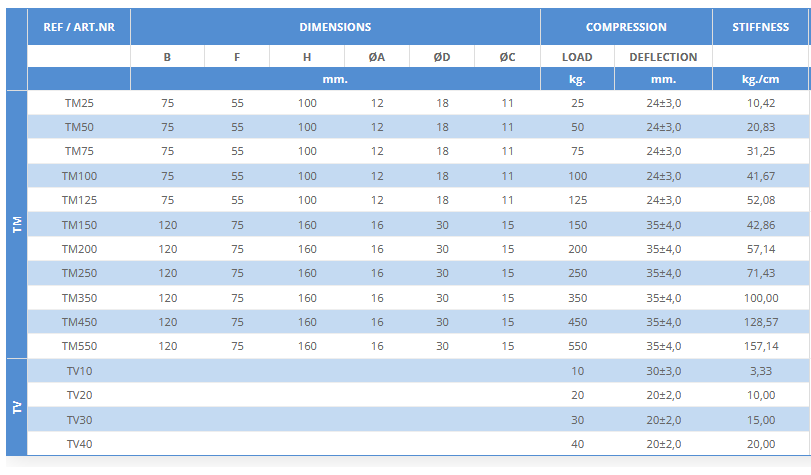 This sustainer mounting is designed as ceiling support for the isolation of noises, shocks and vibrations at the generating source (ACTIVE ISOLATION). It is also indicated for the protection of false acoustic ceilings against transmission of noises, vibrations and shocks (PASIVE ISOLATION). Compression loaded steel spring isolators with 85% isolation, according to the following deflections and rpm: