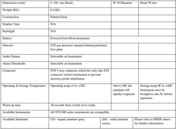 The STS DP2 is a real Thermo DP2 probe, but with a STS gas detection head rather than a real detector. STS electronics installed within the host instrument power the gas detection system and the signal generated is displayed on the host instrument as counts. The Probe detects the presence of the STS LS1 liquid simulant spray placed on surfaces and clothing.