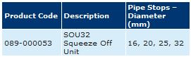 Pipe range: 16 – 32mm diameter. The SOU32 is used to limit the flow in PE pipe. Different diameters can be accommodated by using the appropriate ‘Pipe stop’ setting to ensure the optimum ‘squeeze gap’.