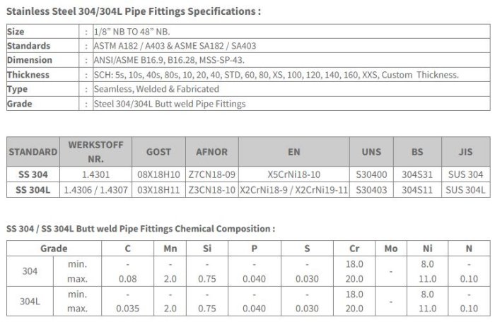 SS 304 Pipe Fittings, SS 304L Butt weld Pipe Fittings Manufacturers &Suppliers in Mumbai India.