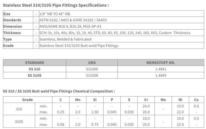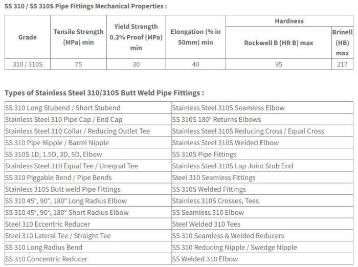 These pipe fittings products are very popular in India market with our best: quality and competitive price We specialize in stainless steel pipe fittings like stainless 310 elbow, steel 310 tee, ss 310S reducers, 310 coupling, UNS S31000 pipe fittings, 310 cross, ss 310 fittings, ss 310 pipe bends, ss 310S stub end, 310 pipe caps . These fitting s are known for excellent finish, high-strength, less maintenance & longer life.
