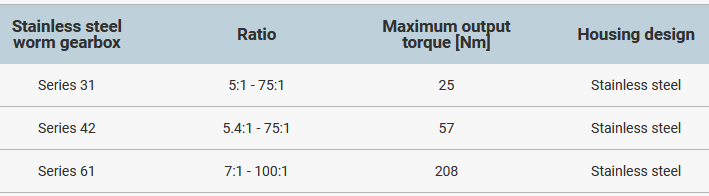The gearboxes are as standard supplied with a center distance of 31, 42 and 61 mm with gear ratios from 5:1 to 100:1 and with an output torque of up to 900 Nm.