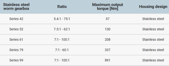 To reduce the risk of bacterial growth, the design is characterised by smooth machined surfaces without unnecessary flanges, recesses and mounting holes. It is also possible to order the gearboxes with torque arm, side flange, free worm and plug-in shaft. Other adjustments are performed on request.