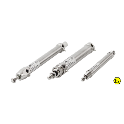 The standard UNIC Stainless Cylinder conforms to the DIN/ISO 6432 specification, featuring diameters ranging from Ø12 to Ø25 mm. These cylinders incorporate a permanent magnet and come with end stroke-cushioning, with the Ø25 variant offering adjustable end stroke-cushioning. Built for robust performance, these cylinders are fitted with nitrile rubber (NBR) or polyurethane (PU) packings and a POM piston. They can withstand maximum pressures up to 10 bar and operate effectively within a temperature range of -20°C to +80°C. Designed with a standard stroke length between 10 and 500 mm, these units are constructed from AISI 316L stainless steel, providing benefits such as chemical resistance and heat resistance. Optional features include ATEX certification, a variety of mounting options, and custom adaptations. Replacement kits are available to facilitate easy maintenance.