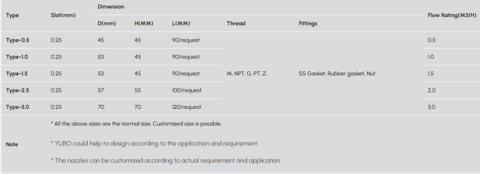 Filter nozzle, also called strainer nozzle, stainless steel filter nozzle, water filter nozzle, wedge wire screen nozzle, wire mesh filter nozzle, water & gas strainers, etc. The wedge wire filter nozzles are mounted on a support plate. The design and quantity of this stainless steel filter nozzle will be depending on the application and customer-flow requirements. YUBO not only provides normal filter nozzle products but also does OEM design services for every client.