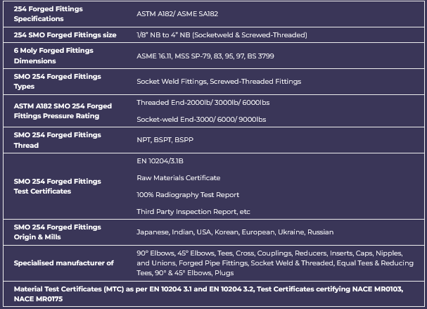 SMO 254 Forged Fittings,ANSI/ASME B16.11, BS3799, ASTM A403 SMO 254 Forged Pipe Fittings Manufacturer, Exporter & Suppliers,SMO 254 UNS S31254 Threaded Forged Pipe Fittings, Socket weld Forged Pipe Fittings, Forged Elbow Suppliers in India. Stockist of 254 SMO Forged Elbow, SMO UNS S31254 Forged Pipe Fittings, SMO 254 Forged Fittings, UNS S31254 Socket weld Fittings, SMO 254 / 6 Mo Threaded Fittings Supplier, SMO 254 Forged Screwed Fittings Exporter, SMO 254 Threaded Plug, SMO 254 Socket Weld Cap, ASME SA182M SMO 254 Class 6000 Fittings, SMO 254 / 6 Mo Equal Tee, Manufacturer Of ASTM A182 SMO 254 Bushing, SMO 254 ASTM A182 Cross, SMO 254 Full Couplings,Elbow, Werkstoff No 1.4547 SMO High Pressure Forged Fittings, SMO 6Mo Forged 90 Deg Threaded Elbow